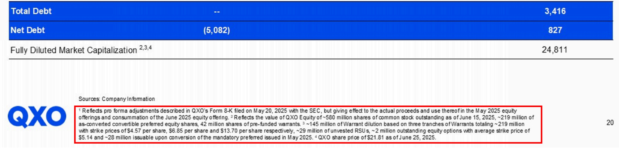 Another note to emerging students of finance: you discern the list above by a) most often, a careful reading the Equity footnote in the financial statements, b) if the company in question has recently issued equity, the summary in the most recent prospectus will give you a nice list, and/or c) if the capital structure is complex, the company may show you the math in an investor presentation. In the case of QXO, b and c are available in addition to the always-available a.