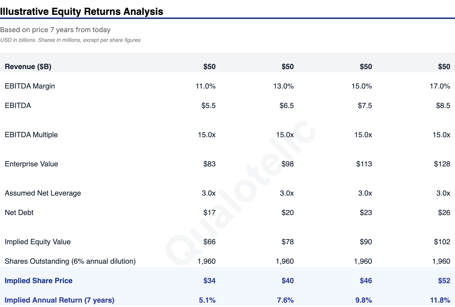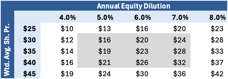This shows that the acquired EBITDA requires $16B to $32B of financing from either new equity or cash flow. In the center shaded values of the sensitivity below, we see the range of 5% to 7% annual equity dilution at a weighted-average stock price during that time of $30 to $40 per share impl. These assumptions are debatable, but we’re working with something directional.