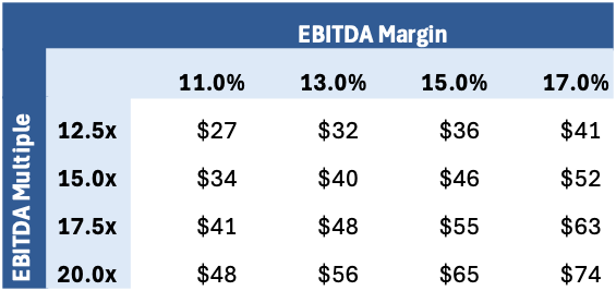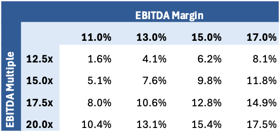 What do future share prices and returns look like if the EBITDA multiple isn’t 15x, and is either lower or higher? To get into 15%+ return territory, you’d have to believe in a 17% EBITDA margin at a 15x multiple or a 20x multiple at a 15% EBITDA margin.