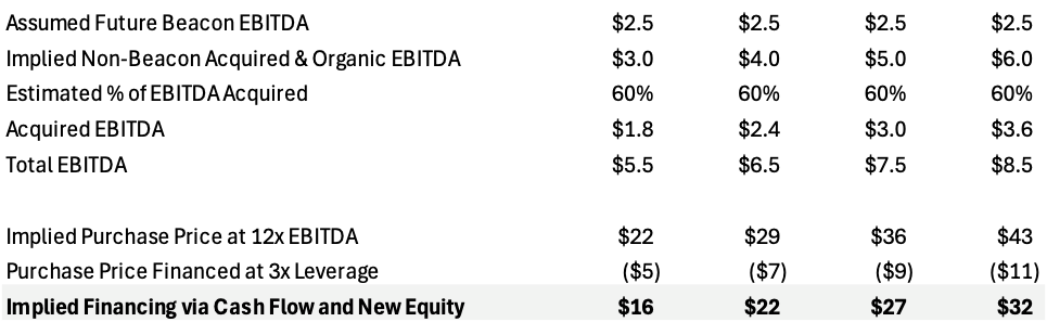 - Net leverage of 3x at our future valuation date in 7 years. Future EBITDA will have been a result of acquired EBITDA and EBITDA achieved through organic growth of a) Beacon and b) future acquired business. The acquired EBITDA will be financed with a combination of debt, newly issued equity and free cash flow